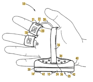 Some innovations in computer mouse technology include developments in both form and function. US6850224B2 introduces a wearable ergonomic computer mouse. The computer mouse includes a mouse base (14) that is removably attached to a user’s hand, a mouse ball (12) supported within the base, and fingerstraps (20) that are removably attached to a user’s fingers. The fingerstraps (20) include mouse buttons (18) and a miniature mouse ball (22) for controlling operation of the computer mouse, in addition to the mouse ball of the base. This design separates and shuffles arrangement of the commonly known mouse ball and button elements. Consequently, technical modifications are made to the function of the wearable mouse compared to more common designs. The wearable mouse hasn’t seen widespread popularity, but the appeal of ergonomics continues to prevail, and innovators provide consumers with a wide range of options to best suit their interests.